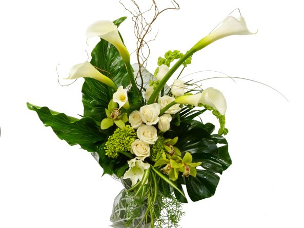 A stunning bouquet featuring Calla Lilies, Roses, Cymbidium Orchids, Curly Willow, mini Hydrangeas, filler and exotic greens