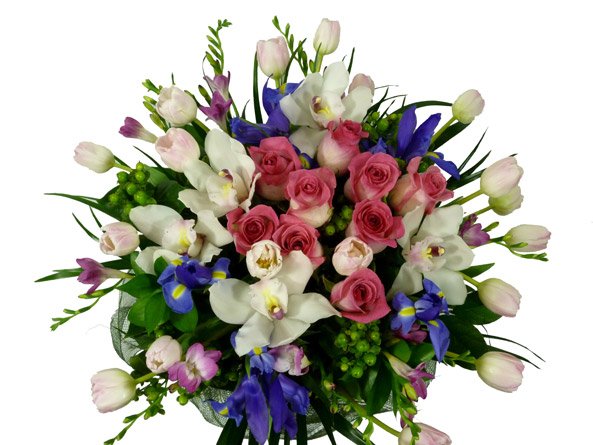 A regal bouquet featuring Irises, Roses, Cymbidium Orchids, Tulips, Berries, Freesia and exotic greens