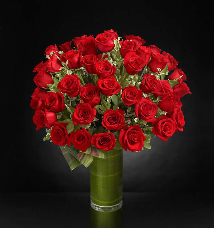 Your passion is written in the stars with a burst of fervent red blooms. Classic red roses are pleasingly designed in a glass vase accented with ti leaves, letting them know your fate, and your heart, is in their hands.