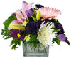 This beautiful glass vase is filled with daisies, lilies, gerberas, carnations and greens