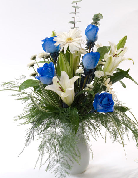 lilies, blue roses, gerberas, mums, mixed green, vase