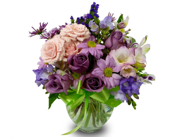 This vase arrangement features Roses, Daisies, Freesia, Statice, filler, greens and Spray Roses
