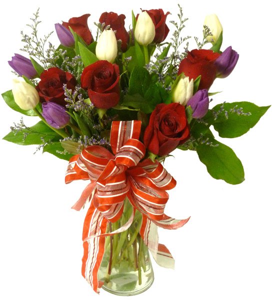 A lovely duo of tulips, roses and greens in a glass vase with a bow