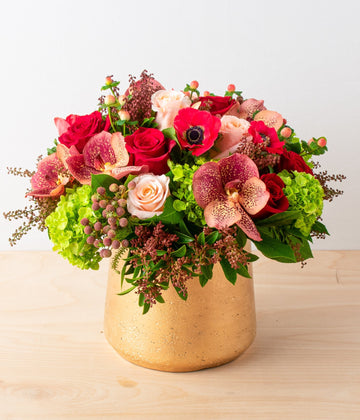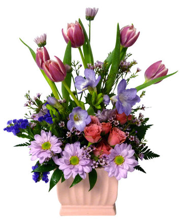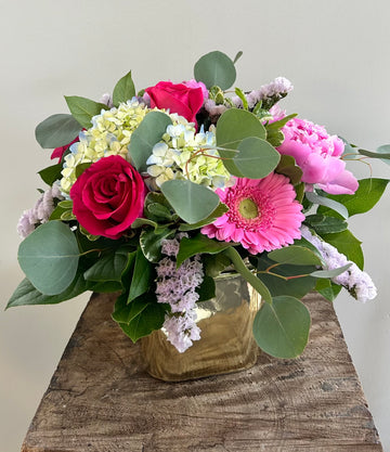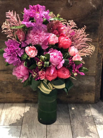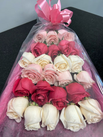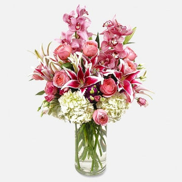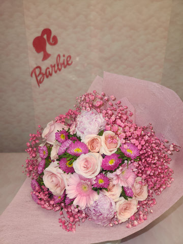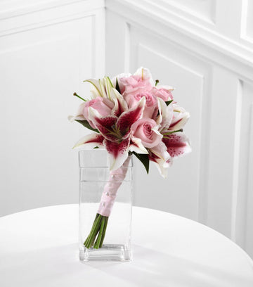 6 Pink Roses and 4 Pink Lilies, Handtied with Satin Ribbon and White Pearl Pins