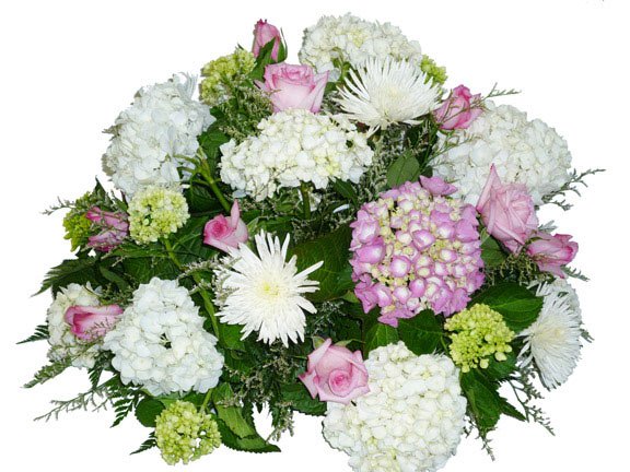 An amazingly lush garden arrangement with fresh cut roses, anastasia, hydrangeas and greens