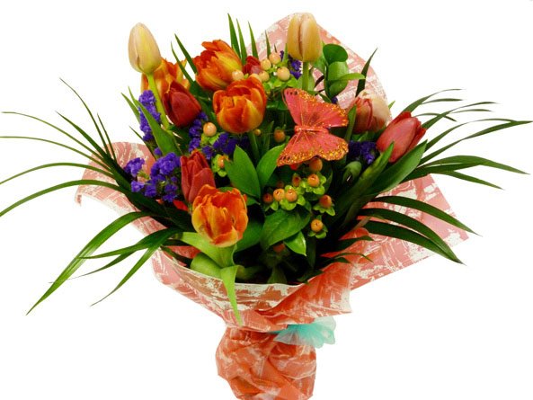 This bouquet contains stunning Static, Berries, Tulips and exotic greens