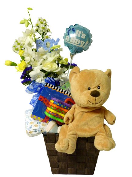 A beautiful package for the joyous new addition. Features plush toy, socks, toys, mini balloon,Roses, Orchids, Statice and greens