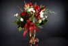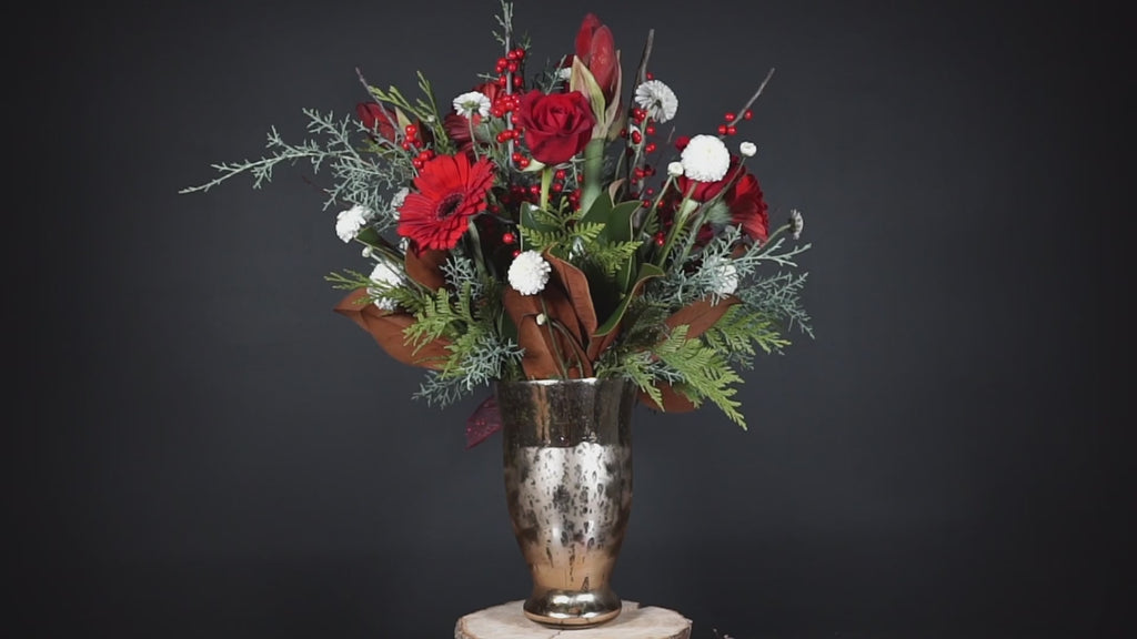 A luxurious floral vase featuring Amaryllis, roses, ilex berries and fresh evergree, selver and gold accents add a sence of opulence to create a stunning centerpiece for a sophisticated holiday setting.