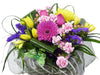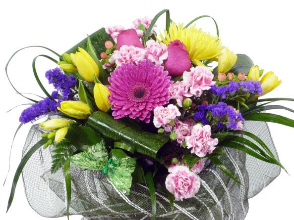 A beautiful bouquet of an assortment of Carnations, Roses, Gerberas, Statice, Tulips, Berries, Freesia, Berries and exotic greens