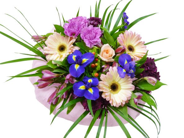 This Euro-wrapped bouquet features Irises, Roses, Alstromeria, Berries, Carnations, Gerberas, and exotic greens