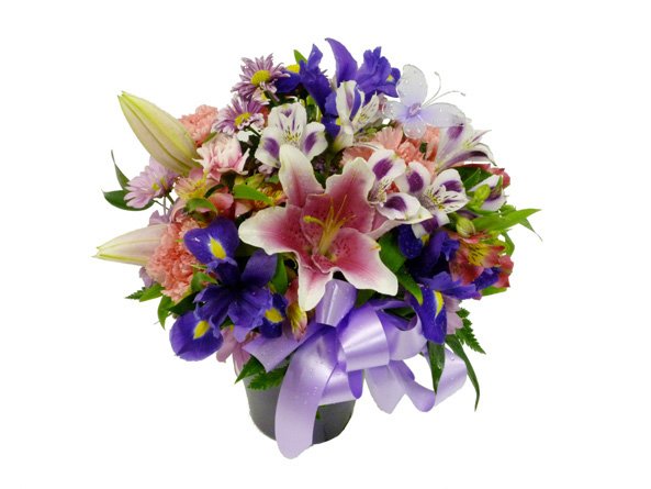 A stunnning and bright bouquet with Carnations, Irises, Alstromeria, Lilies, filler and greens