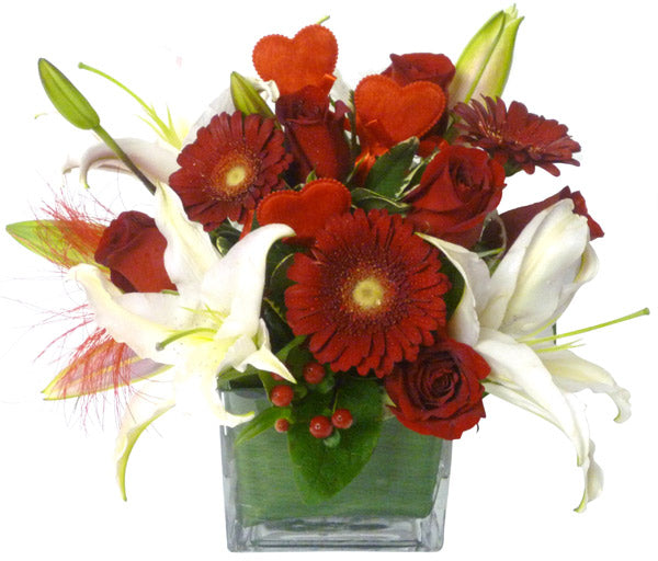 A bright and romantic arrangement in a cubed glass vase with roses, lilies, gerberas and greens