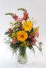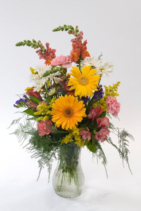 This beautiful mixed flower arrangement features Gerberas, Solidago, Snapdragons, Alstroemeria and greens filled in a glass vase