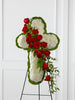 The Floral Cross Easel is a symbol of love and faith to honor the deceased at the final farewell service. White carnations are arranged to form a cross in which an accent of red roses, spray roses, and lush greens are draped across the center, creating a beautiful display of serene elegance.