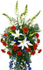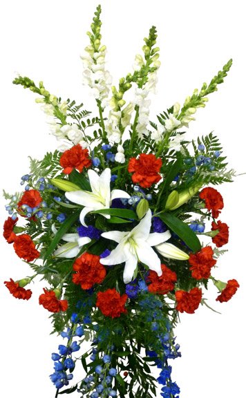 A beauitufl funeral spray with vibrant colours featuring lilies, snapdragons, carnations and an assortment of greens