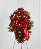 The Treasured Memories™ Standing Spray is a rich and colorful way to express your unending love and devotion to the departed. An exceptional arrangement of red roses, burgundy carnations, burgundy mini carnations, red gerbera daisies and white button poms are accented with a variety of lush greens. A red ribbon with the word, "Beloved," embossed in a gold metallic lettering, finishes this beautiful display for their final farewell service. Displayed on a wire easel.