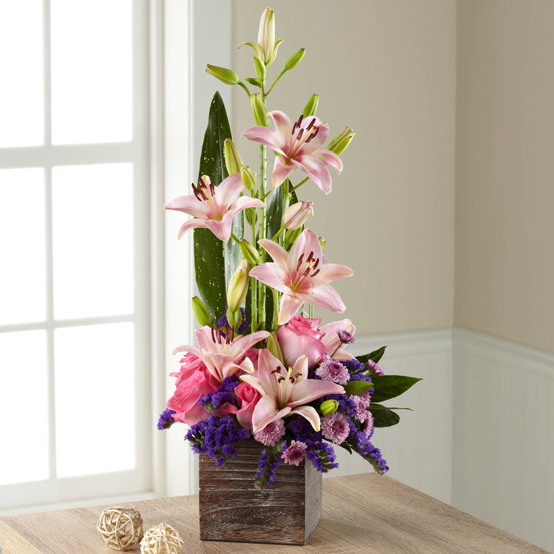 Designed by a true artist to create a unique gift for your recipient this spring season, this flower bouquet is set to make a memory. Stems of pink Asiatic Lilies bloom with multiple flowers creating height and interest with pink bi-colored roses, lavender button poms, purple statice, and lush tropical leaves at the base. Presented in a square wooden planter to give it a natural, rustic look that offsets the elegance of this exquisite design, this flower arrangement has been designed for you to