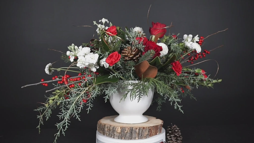 An elegant holiday centerpiece featuring a combination of rich reds and greens. The result is a sophisticated and festive focal point for your holiday table.