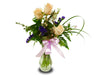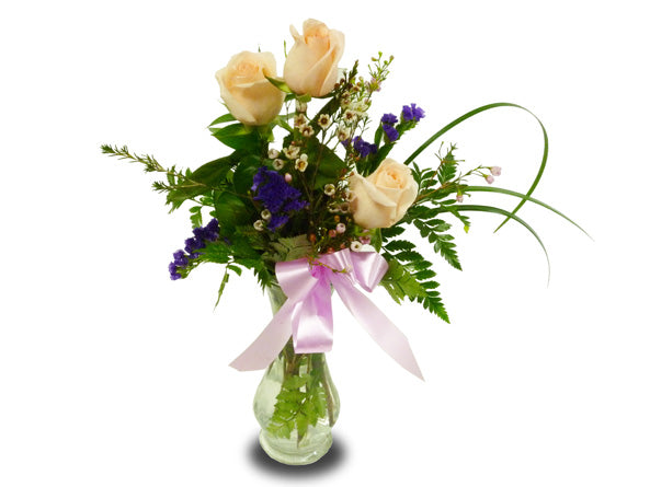 This small vase contains 3 stunning Roses with filler and greens with a bow