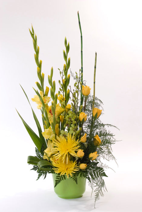 A perfect bright yellow piece for a funeral featuring Orchids, Gladiolas, Roses, Fuji Mums, tropical greens in a ceramic pot