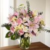 Soft, feminine, and blooming with a flowering finesse at every turn, this gorgeous fresh flower arrangement has a classic elegance to it that simply never goes out of style. Pink Asiatic Lilies serve as a focal point to this flower bouquet surrounded by cream double lisianthus, pink carnations, white spray roses, pink statice, and pink roses, lovingly accented with fronds of Queen Anne's Lace, stems of baby blue eucalyptus, and lush greens. Presented in a classic clear glass vase, this gorgeous