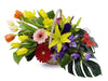 This wicker basket is filled with Freesia, Tulips, Daffodils, Gerberas, Lilies and exotic greens