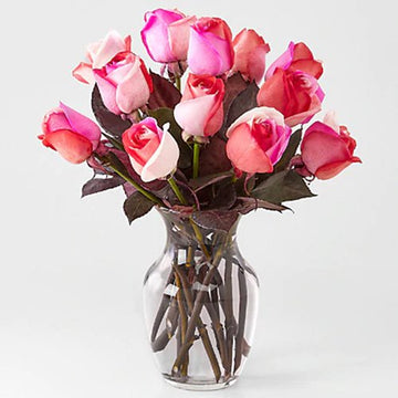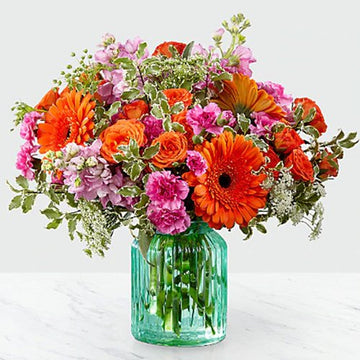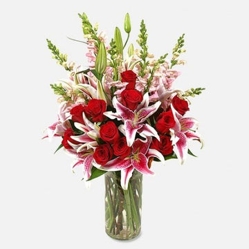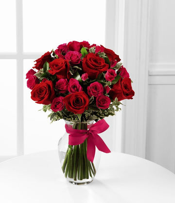 Hot Pink and Red Assortment of Flowers in a Vase with Greens