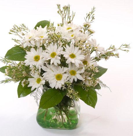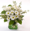 A beautiful white bouquet held in a glass vase featuring Daisies , Wax flowers and Salal