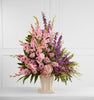 The Flowing Garden™ Arrangement bursts with a bounty of blooms to create a stunning tribute of the deceased at their final farewell service. Lavender roses, pink gladiolus, purple dendrobium orchids, purple larkspur and pink hydrangea are accented with an assortment of lush, vibrant greens and perfectly arranged in a papier mache urn to create a presentation of grand beauty that symbolizes the life of the departed.