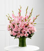 The Lovely Tribute™ Bouquet is a warm and blushing display of peace and beauty, set to honor the deceased and bring comfort to family and friends. Pink gladiolus, pale pink roses, bi-color pink roses, pink Asiatic lilies and an assortment of lush greens create a sophisticated arrangement seated in a clear glass gathering vase, symbolizing your heartfelt love and sympathy.