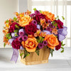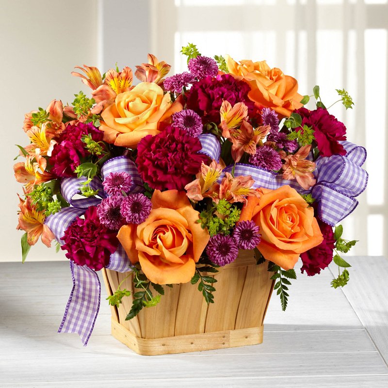 With life's many twists and turns, there is always a new dream ready to take hold around the corner! In celebration of any of life's special moments, this lush and lovely fresh flower arrangement sends your warmest wishes in style. Orange roses, purple carnations, orange Peruvian Lilies, purple button poms, bupleurum, and lush greens are accented with a lavender gingham ribbon and presented in a rectangular woodchip basket to create a special surprise for your recipient. A wonderful way to say h
