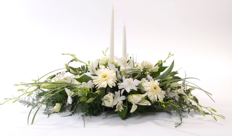 This centerpiece arrangement features lovely Lilies Orchids, Gerberas, candles and greens