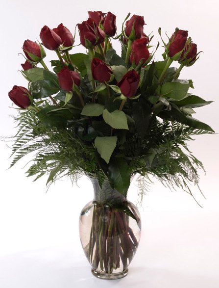 18 beautiful long stemmed Red Roses and a mix of greens in a glass vase