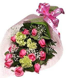 A beautiful presentation item for someone you love. Contains 12 pink Roses, Babies Breath, Tropical greens, Hydrangeas tied with a coloured net and bow