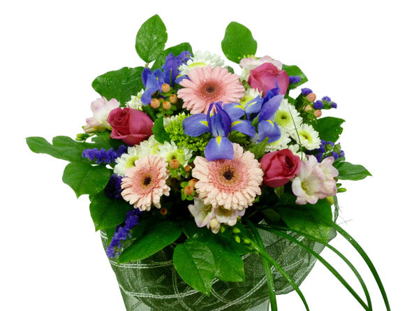 A stunning mixture of Gerberas, Roses, Irises, Freesia, Mini Hydrangeas, Statice, Berries and exotic greens