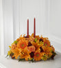 The Bright Autumn™ Centerpiece spins the magic of the Fall season with each sun-kissed petal to set your gathering space aglow with blooming beauty. Two taper candles are surrounded by a gorgeous arrangement consisting of orange Asiatic Lilies, gerbera daisies, and roses with golden Peruvian Lilies, burgundy cushion poms and assorted greens to create the perfect addition to your Autumn celebration.