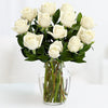 A dozen of fresh cut white roses arrive perfectly arranged with Baby's breath and premium Italian greenery in a clear glass vase.