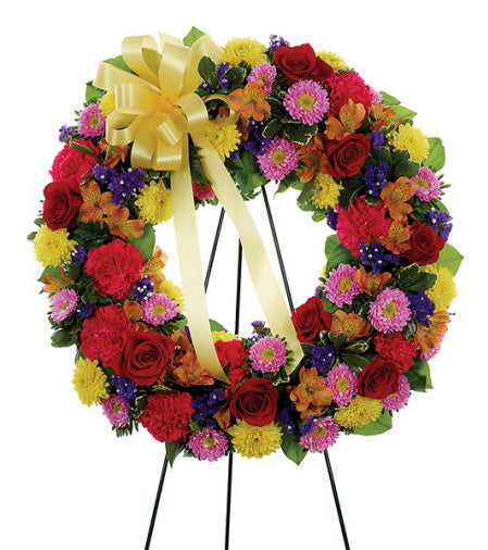 It is a time of sadness, but life does go on, and this brilliantly colored wreath of orange, red, yellow, pink, blue, and purple flowers is a tasteful reminder.