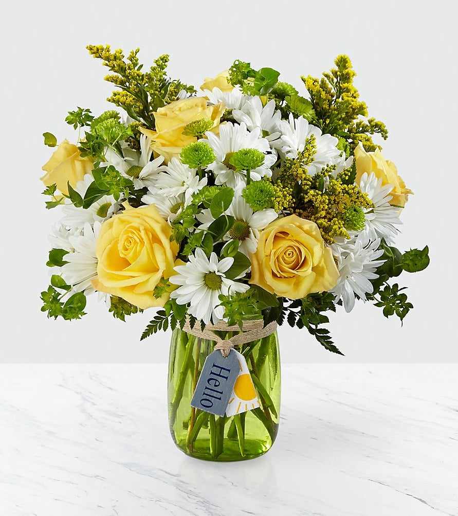 Light yellow roses, white daisies, and fabulous greenery are delivered in a glass vase. Sending this pretty arrangement will definitely do the trick.Approximately 11 1/2" W x 10" H