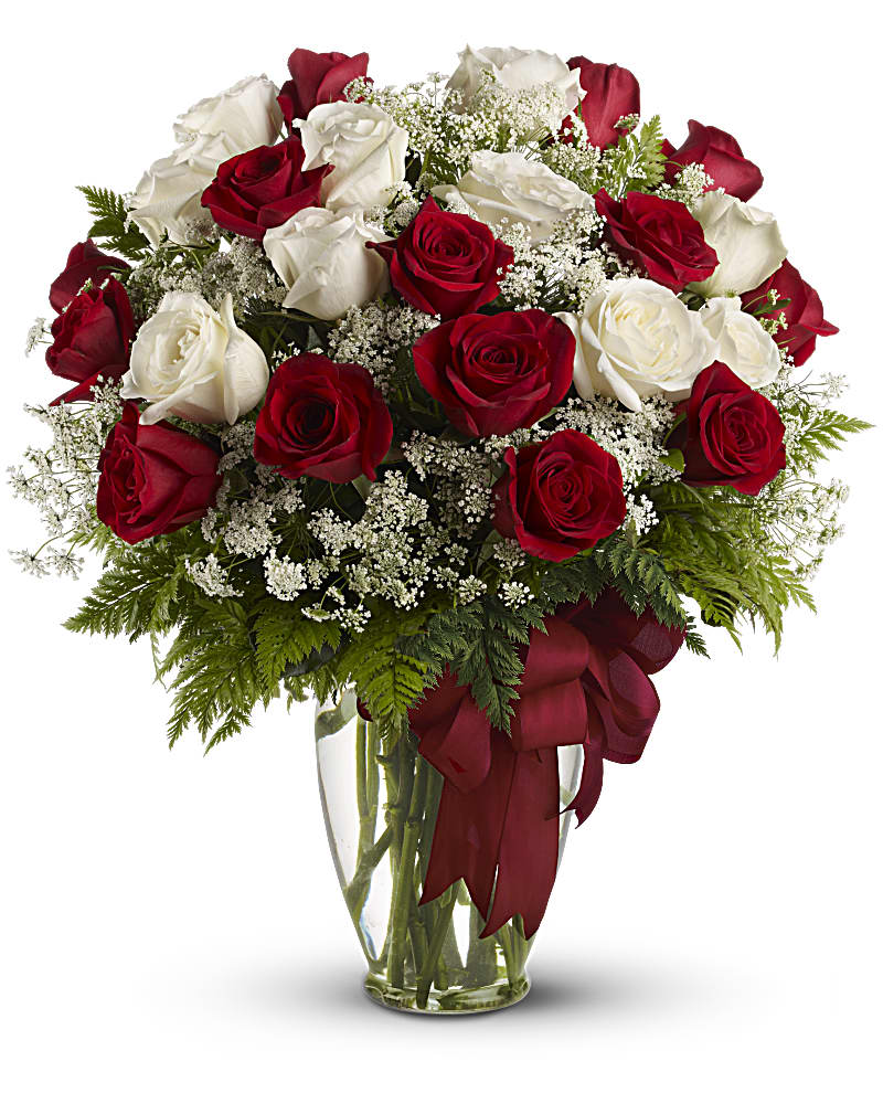 Love is divine, and roses are too. At almost two feet tall, this beautiful bouquet of red and white roses – accented with white filler, and adorned with a bright red ribbon – is a timeless Special Day gift for your beloved.