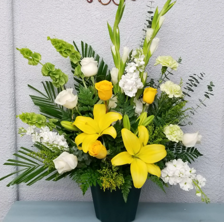 Send comforting wishes with an arrangement in all the bright colors of the sun, including white gladioli to show the strength of character, and roses to symbolize fidelity.