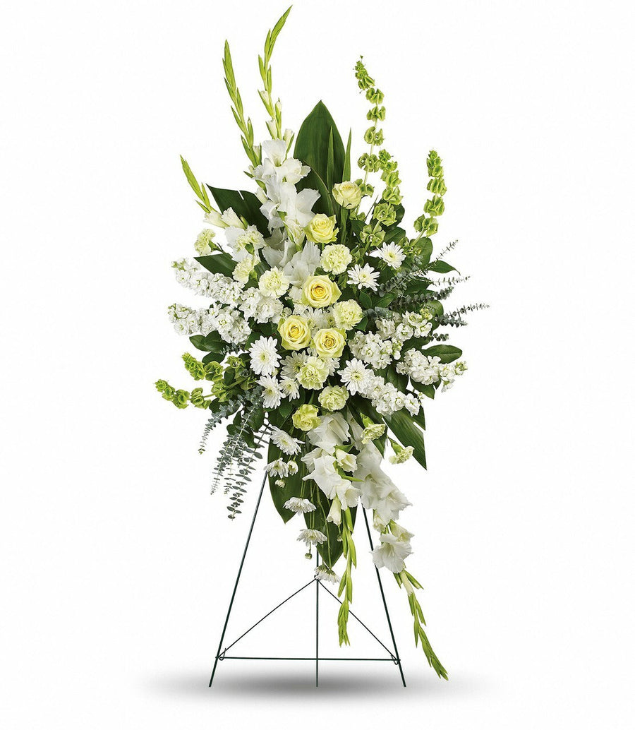 Lovely and thoughtful, a traditional remembrance spray of bright white flowers promises that love is eternal, and expresses your sentiments with grace.