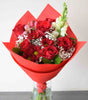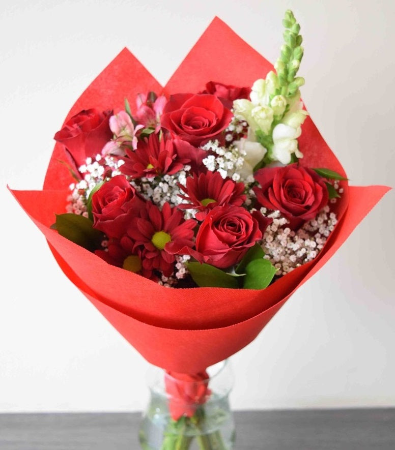 This arrangement will surely reach your sweetheart this Valentine's Day! This bouquet includes bright red roses, mums, lush pink alstroemeria, baby's' breath.