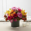 The Color Mix™ Arrangement is a bright and beautiful centerpiece set to bring color and life to your wedding reception. Fuchsia roses, light pink roses, orange parrot tulips, hot pink mini calla lilies, orange LA Hybrid Lilies, orange spray roses, and hot pink spray roses are gorgeously arranged in a clear glass cylindrical vase showcasing ti leaves around the stems to give it a fresh and alluring look.