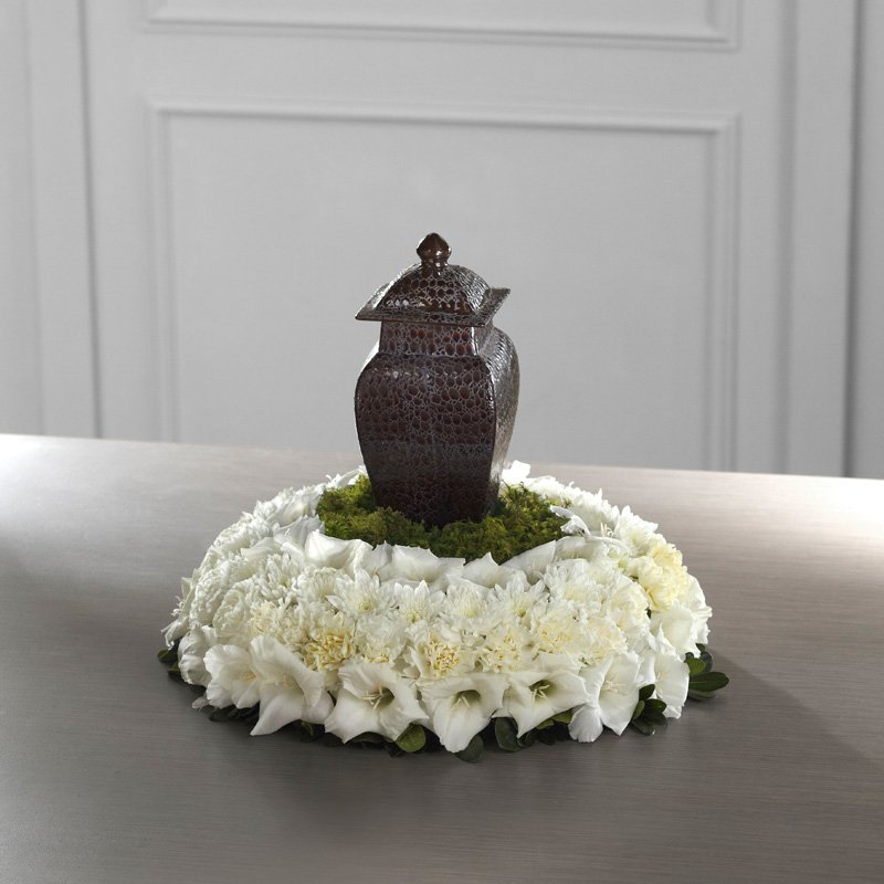 A ring of heavenly white blossoms makes a beautiful, serene and dignified setting for an urn containing the cremated remains of a loved one. The tabletop wreath is constructed by a local artisan florist of white cushion pompons atop a base of variegated greens with a flat bottom for stability when displayed. Its design allows for multiple options for display include enhancing a religious statue, personal memento, photograph or candleholder.