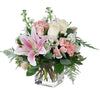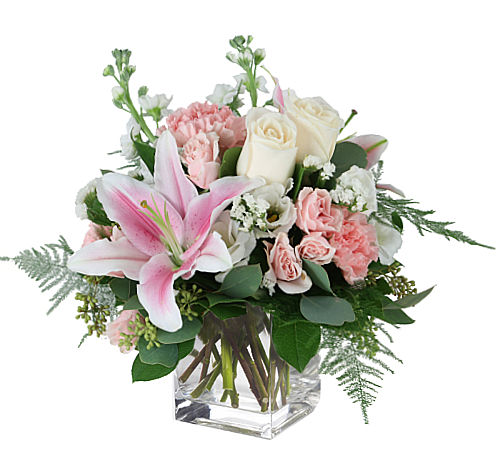 This romantic bouquet reveals all the feelings you have in your heart. Fresh-picked pink & white blooms are on display inside a clear cube vase, creating a timeless gift for someone you love.