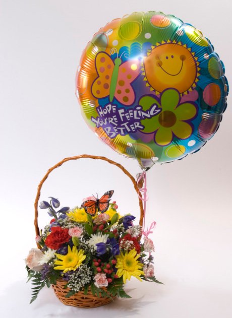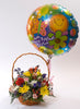 Happy Birthday wicker basket includes a balloon and blooms including Carnations, Daisies, Berries, greens, Mini Carnations, Delphinium