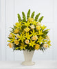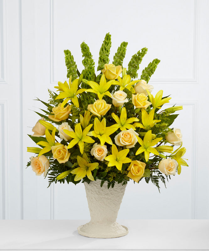 The Golden Memories™ Arrangement bursts with sunlit beauty to honor the life of the deceased. Brilliant yellow Asiatic lilies, roses and solidago are offset by cream roses, Bells of Ireland, teepee palm fronds and lush greens to create a dazzling display. Arranged in a large papier mache urn, this incredible presentation of floral grace will bring a cheerful elegance to their final farewell service.