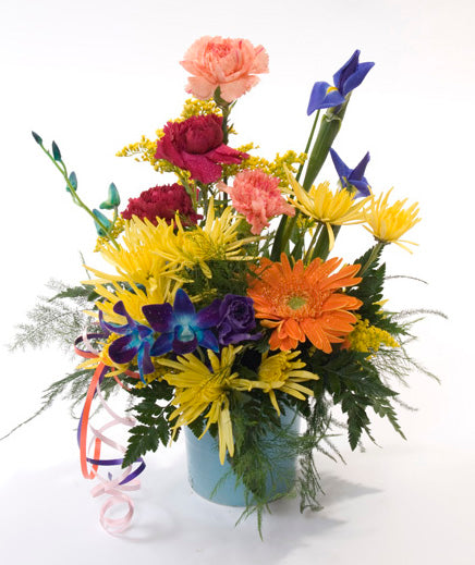 Bright and beautiful Growing up arrangement features various Carnations, Mums, Gerberas, Orchids, Irisis and greens in a ceramic container or cup