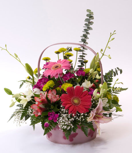 Happiness is colourful includes a bright basket featuring Gerberas, Orchids, Lilies, Statice, Alstroemeria and greens